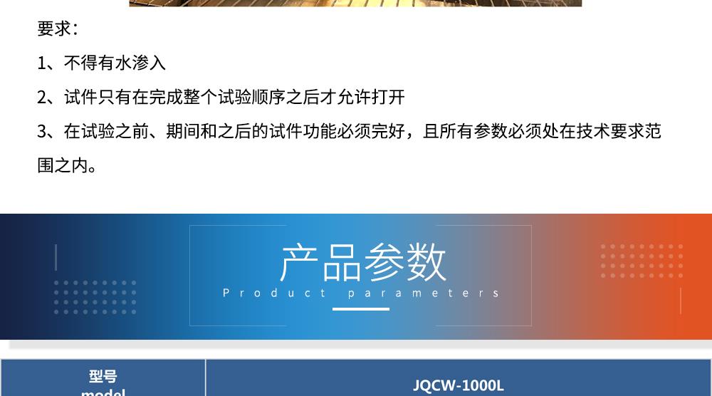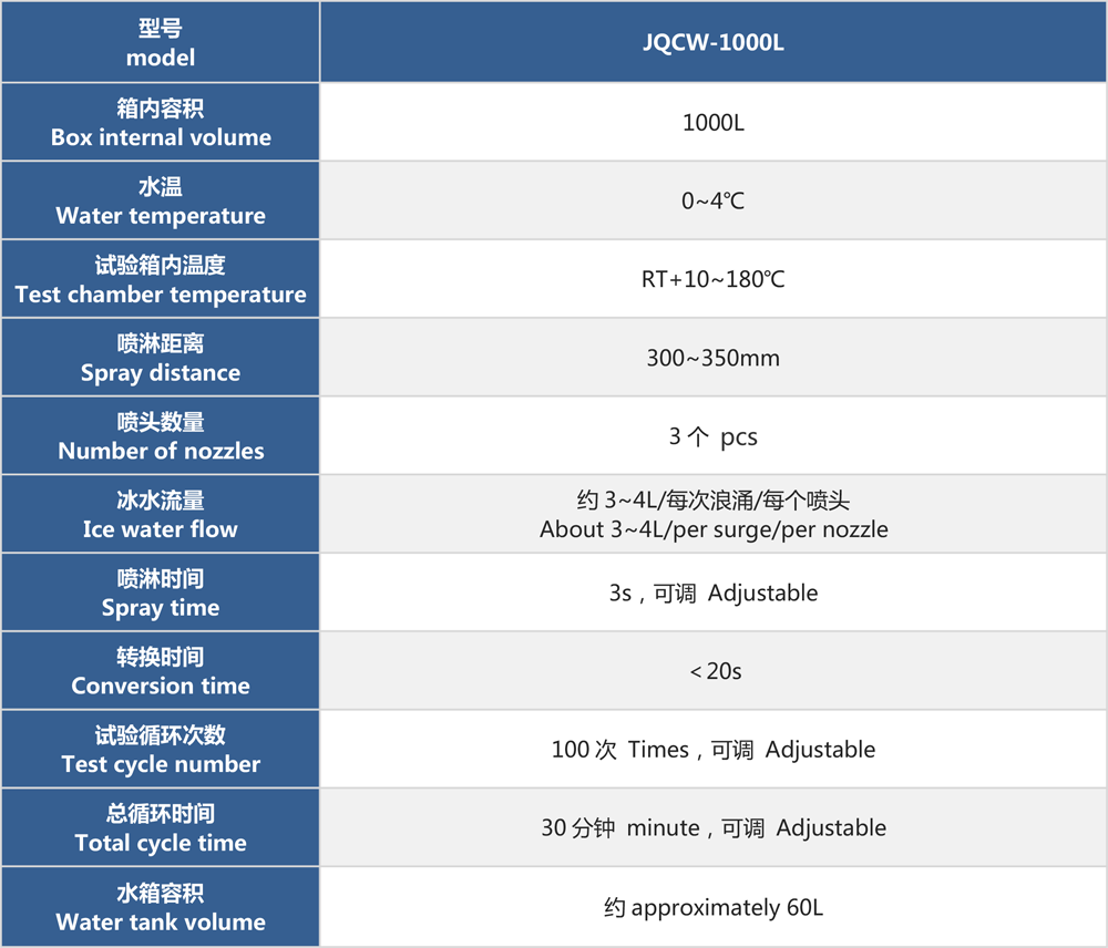 產(chǎn)品型號(hào):JQCW-1000L 品牌:劍 喬 用途:冰水沖擊試驗(yàn)(浪涌水的溫度沖擊試驗(yàn))是模擬部件在駛過積水時(shí)而產(chǎn)生的浪涌水的負(fù)荷情況,保證部件由于水而急劇冷卻情況下的功能穩(wěn)定性。如車輛在冬季有水路面駕駛時(shí)冰水濺落到熱的系統(tǒng)/組件上,失效模式為不同的溫度膨脹系數(shù)導(dǎo)致的材料機(jī)械破裂或密封失效咨詢熱線:13829135130