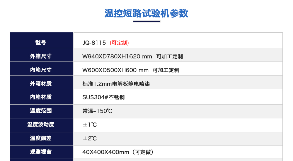 產(chǎn)品型號(hào):JQ-8115(可定制) 品牌:劍 喬 用途:溫控型電池短路試驗(yàn)機(jī)綜合多種電池短路試驗(yàn)標(biāo)準(zhǔn)要求而設(shè)計(jì)按標(biāo)準(zhǔn)要求短路裝置必須符合內(nèi)阻范圍≤5mΩ從而獲得試驗(yàn)要求的最大短路電流咨詢熱線:13829135130