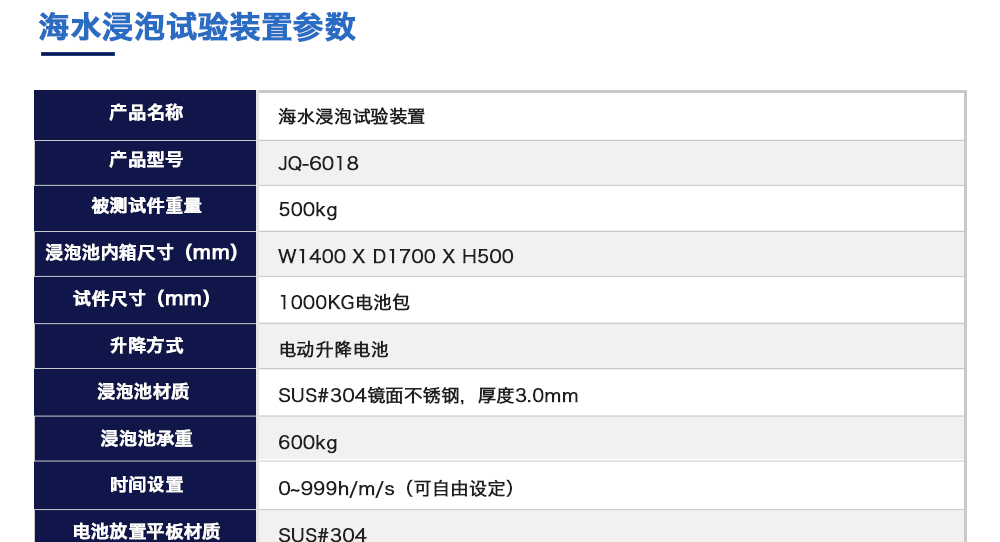 產(chǎn)品型號:JQ-6018 品牌:劍 喬 用途:海水浸泡試驗裝置主要用于電池以實車裝配狀態(tài)與整車線束相連然后以實車裝配方向在常溫下的海水成分中浸泡2h(海水為模擬海水成分,濃度為3.5%NaCl溶液)水槽中海水深度要足以淹咨詢熱線:13829135130