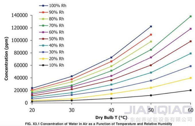 附錄X3中,表3.1是恒定水蒸氣含量下,相對濕度與溫度的關(guān)系。而圖3.1是水蒸氣含量、溫度、相對濕度三者之間的關(guān)系。在考慮了相對濕度對產(chǎn)品材料的損傷性后,大家可以針對一定溫度建立適宜的相對濕度范圍,進而調(diào)整試驗條件。