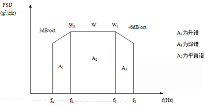 為了簡便起見,往往將功率譜密度曲線圖劃分成若干矩形和三角形,并利用上升斜率(如3dB/oct)和下降斜率(如-6dB/oct)分別算出wa 和w2,然后求各個(gè)幾何形狀的面積與面積和,再開方求出加速度總均方根值。