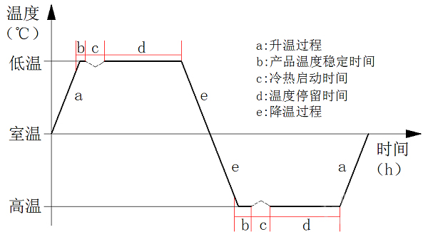 熱循環(huán)試驗(yàn)是一種利用高低溫交變濕熱試驗(yàn)箱對(duì)試驗(yàn)產(chǎn)品進(jìn)行的預(yù)設(shè)高低溫交替的應(yīng)力考核,用以驗(yàn)證材料和產(chǎn)品是否達(dá)到在研發(fā)、設(shè)計(jì)、制造中預(yù)期的質(zhì)量目標(biāo)的一類(lèi)可靠性試驗(yàn)。通過(guò)大溫變速率可暴露產(chǎn)品潛在的材料與性能缺陷,經(jīng)過(guò)不斷地質(zhì)量改進(jìn),達(dá)到可靠性提升的目的。航天單機(jī)類(lèi)產(chǎn)品一次熱循環(huán)示意圖見(jiàn)下圖1所示。